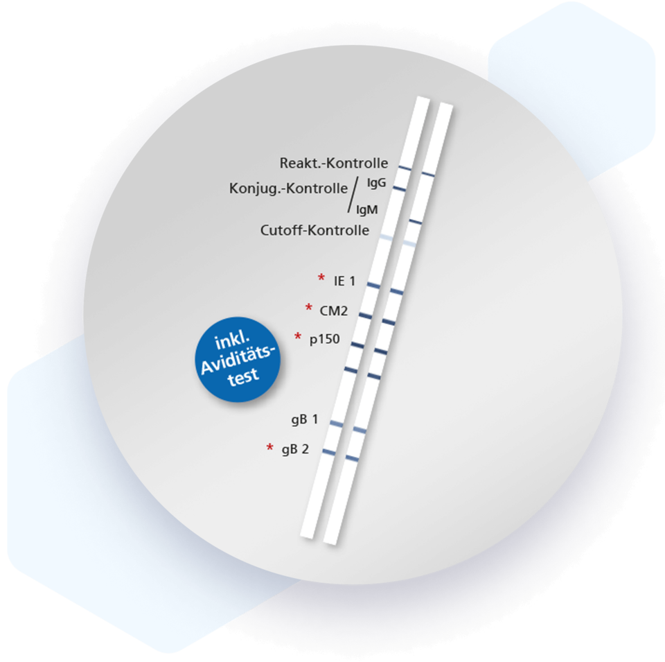 Mikrogen recomLine CMV tests are serological, qualitative in vitro line immunoassays based on recombinantly produced antigens. The test is used as a confirmatory test of positive and inconclusive screening results. The low predictive value of a positive CMV IgM detection, due to persistent IgM or recurrent infection, makes reliable diagnosis of CMV infection particularly difficult. Using the recomLine CMV, IgG, IgM as well as the avidity of IgG antibodies can be determined. Phase-specific antigens and avidity antigens (patented by MIKROGEN on the Immuno-Line Assay) allow detection of antibodies in all phases of infection. In addition to viral load, the recomLine CMV can be used in pregnancy diagnostics as well as in preoperative diagnostics in transplant patients to detect CMV infection and to determine the time of infection.