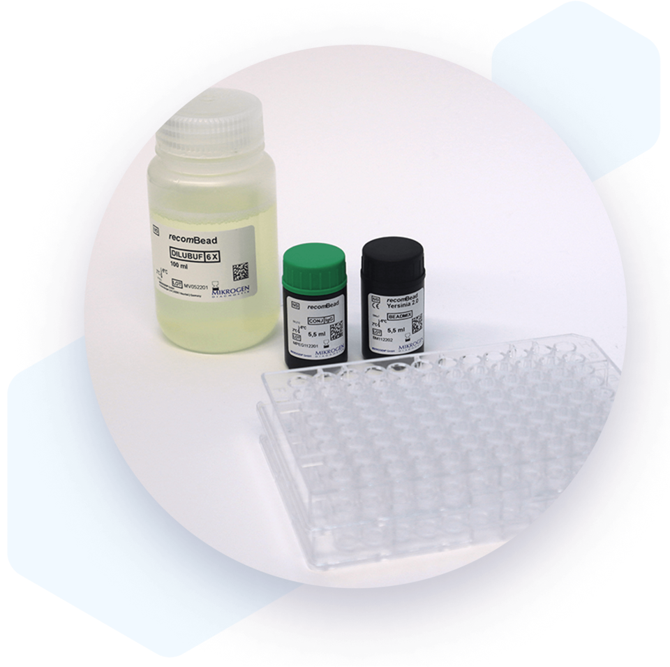 Die Mikrogen recomBead Treponema Tests sind qualitative Immunoassays, mit rekombinant hergestellten Antigenen, zum Nachweis von IgG- bzw. IgM-Antikörpern gegen Treponema pallidum. Sie ermöglichen eine flexible Kombination der Vorteile von ELISA und Bestätigungstest auf einer Platte.